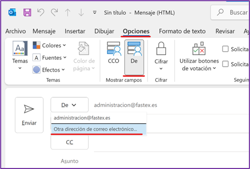 - Selecciona la pestaña de Opciones, marca "Mostrar De" y añade la dirección del buzón compartido como remitente.