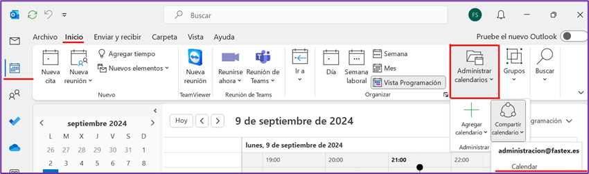 - Ve a calendario y haz clic en Administrar Calendarios y selecciona Compartir Calendario.