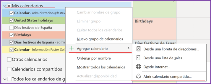 - Accede a tus calendarios compartidos navegando a la sección de calendarios y seleccionando la opción de Abrir calendario compartido...